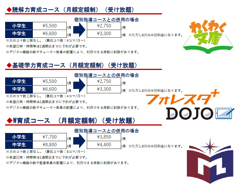 上記については、当塾は月額受け放題の料金設定にすることで、