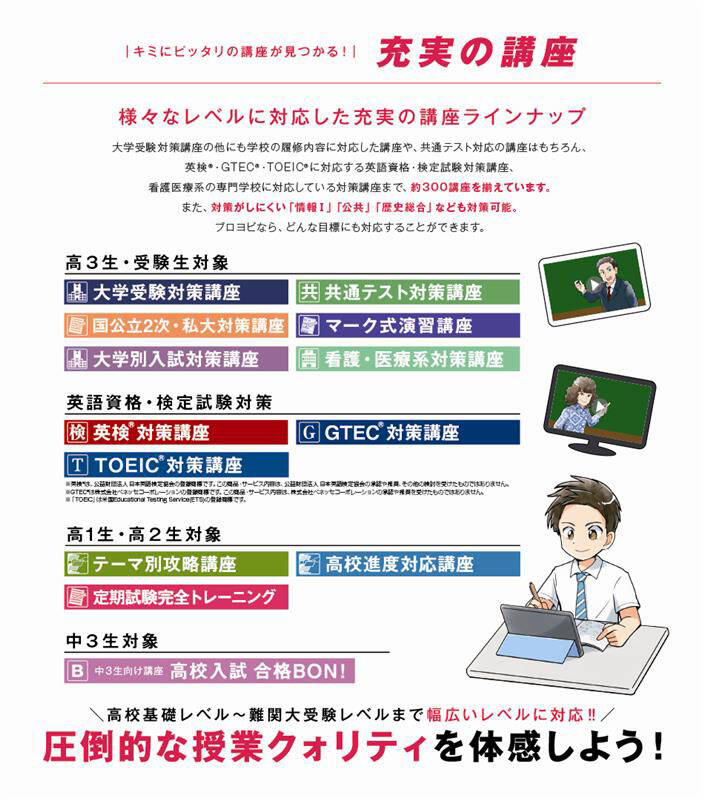 また基礎から難関大対策まで幅広いレベルにも対応。難関大合格に向けた対策から定期試験対策、さらには共通テストや推薦系選抜、英検対策に特化した講座などもご用意!高校生のあらゆるニーズに対応可能です!