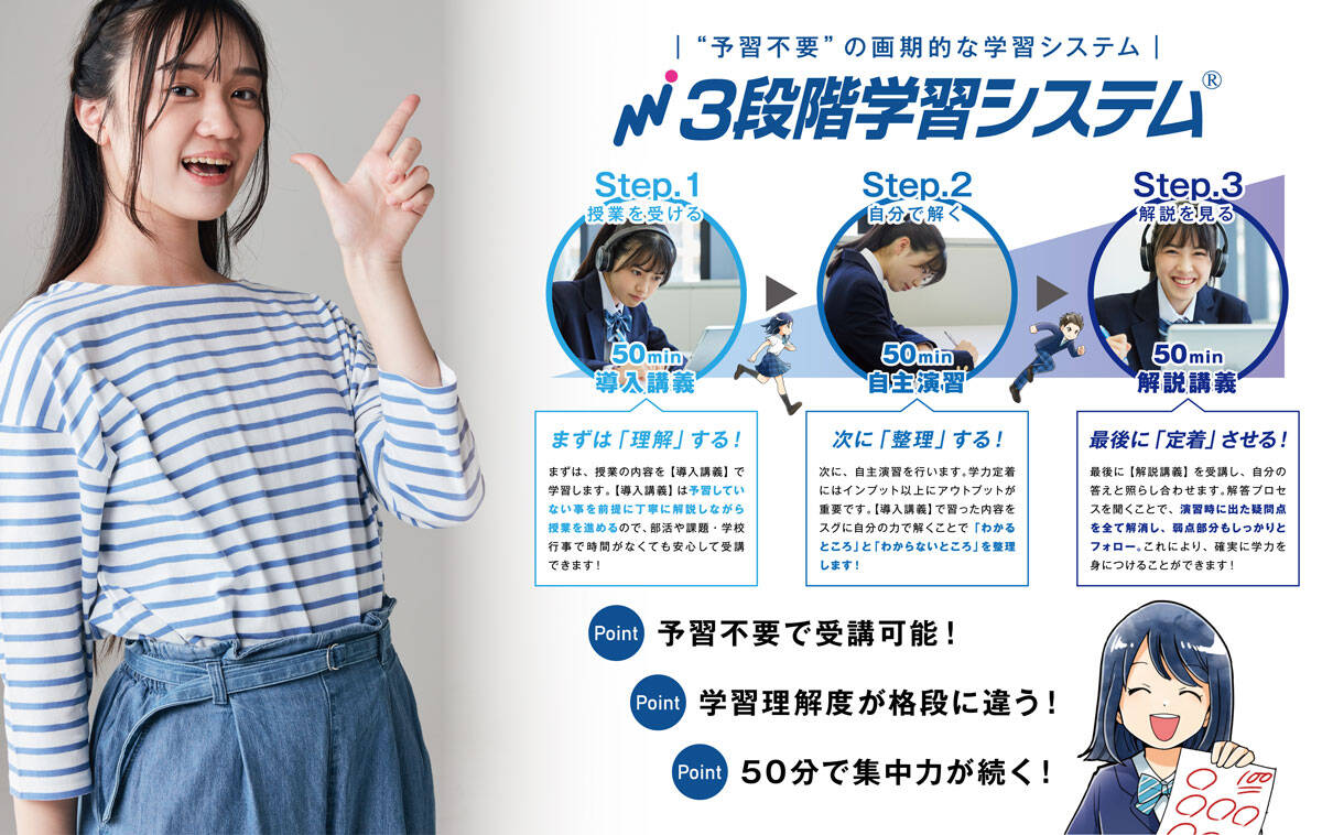 「3段階学習システム」を採用しているため、高校の授業のように事前の予習は不要です。部活動との両立や、高校の課題との両立も問題ありません。